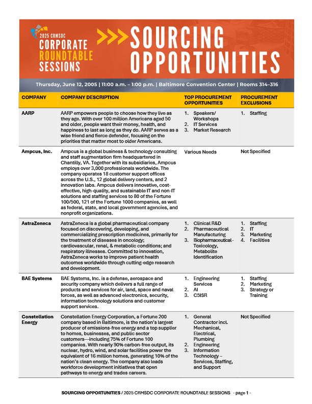 **New for 2025** CRMSDC is hosting our Corporate Roundtable event in conjunction with the Baltimore Mayor’s Office of Small and Minority Business Advocacy & Development at their “2025 Small Business Advancement Conference.“